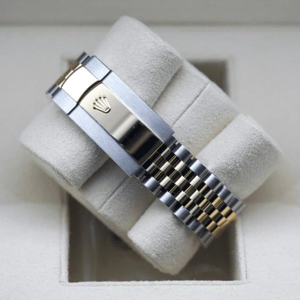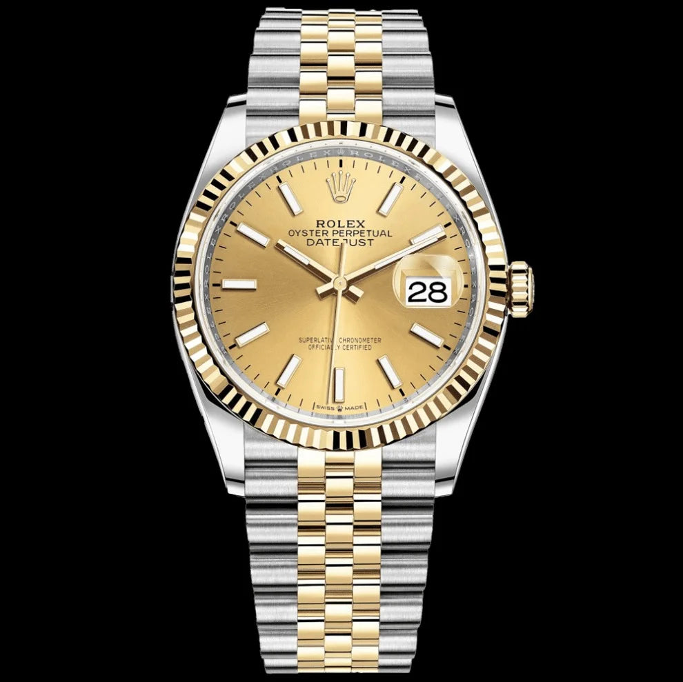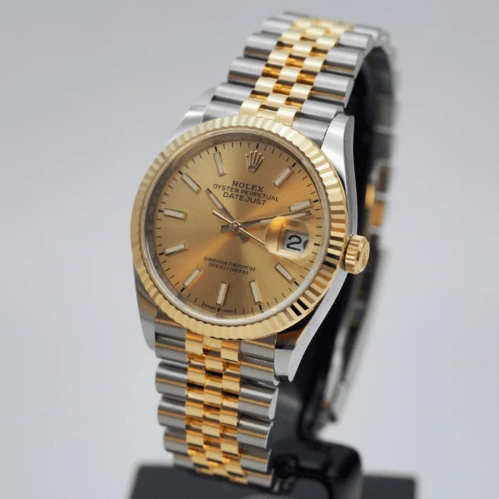 Champagne dial. Dial diameter: 36 mm. Integral middle case, screw-down case back and winding crown, fluted bezel. Screw-in double lock double waterproof system. Crystal: Scratch resistant sapphire, Cyclops lenses dated. Water resistant to 100 meters/330 feet. Automatic winding movement. Power reserve: 70 hours. Functions: central hours, minutes and seconds. Clasp Type: Folding Oysterlock with Easylink 5 mm Comfort Extension.