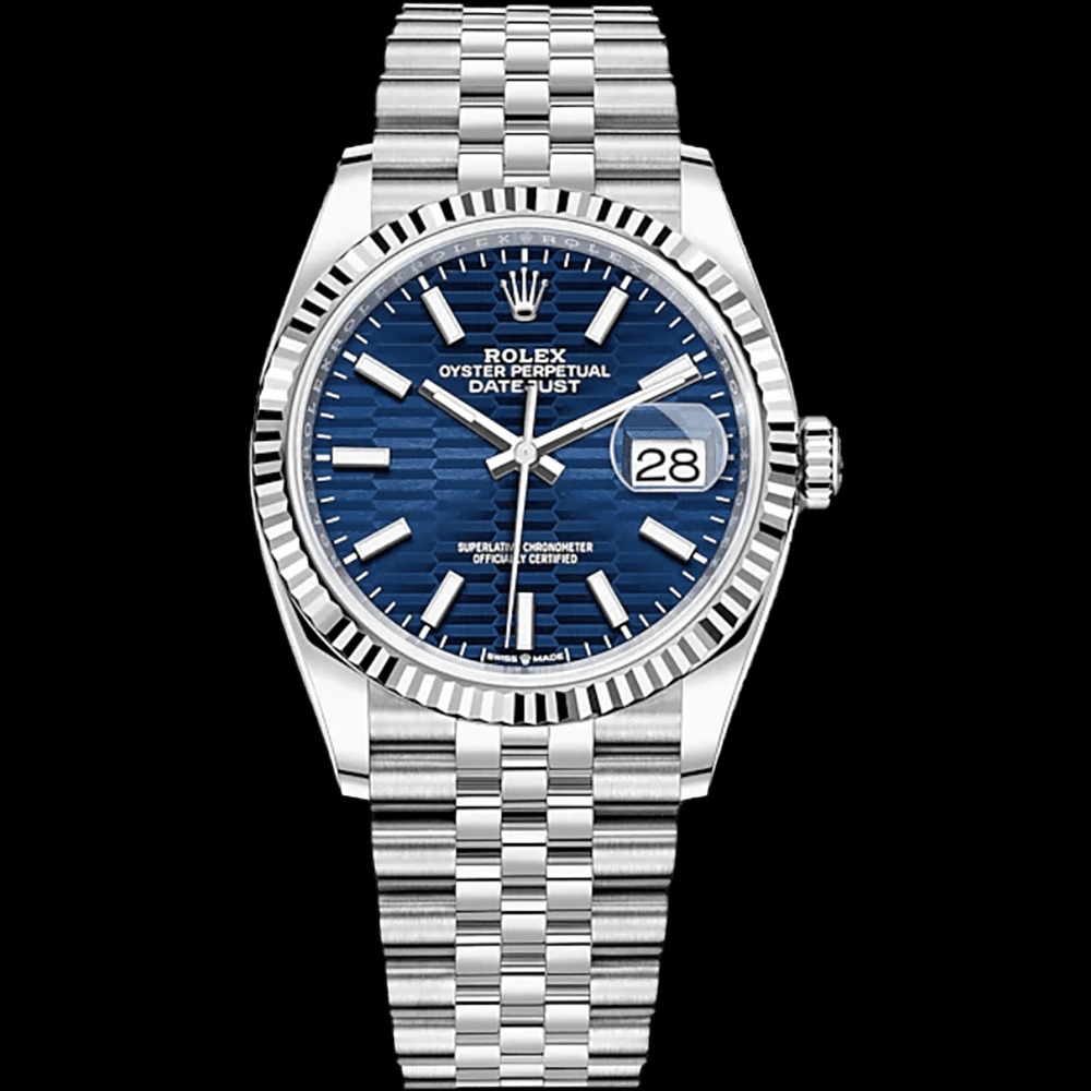 Dial diameter: 36mm, polished 904L stainless steel case. Polished stainless steel Twinlock crown with two sealing areas when screwed into the crown: the first inside the crown tube and the second inside the winding crown. Blue dial. Anti-reflective and scratch-resistant sapphire glass. Polished hands with luminous filling. Polished index hour markers with luminous filling are applied. A fine minute scale is printed around the dial. The date window is displayed at 3 o’clock with a Cyclops magnifying glass. Self-winding movement, functions: hours, minutes, seconds, date. The power reserve is approximately 70 hours. Clasp Type: Folding Oysterlock with Easylink 5 mm Comfort Extension. Water resistant to 100 meters/330 feet.