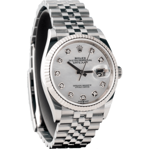 Dial in white mother-of-pearl set with diamonds. Dial diameter: 36 mm. Monocoque midshell. Scratch-resistant sapphire crystal. Screw-in back cover. Screw-in double lock double waterproof system. Water resistant to 100 meters/330 feet. Self-winding movement, functions: central hours, minutes and seconds, instant date with quick setting, power reserve approx. 70 hours. Bracelet Type: Jubilee, Five Piece Links. Folding Oysterclasp with Easylink 5mm comfort extension.