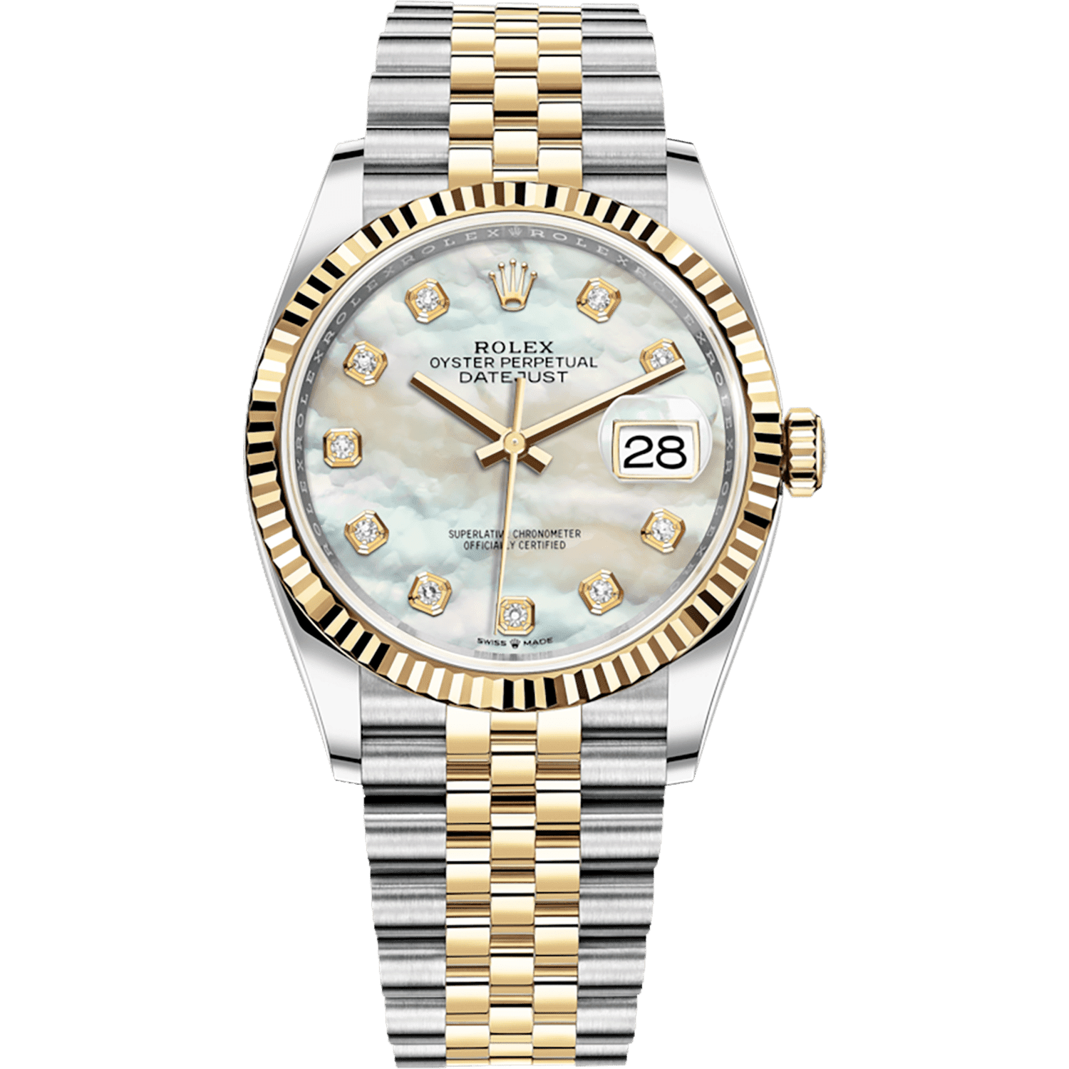 The champagne dial is set with diamonds. Dial diameter: 36mm monobloc mid case. Screw-down case back and winding crown. Notched bezel. Twinlock double waterproof system. Scratch-resistant sapphire crystal. Cyclops lenses are outdated. Water resistant to 100 meters/330 feet. Permanent mechanical self-winding movement, functions: central hours, minutes and seconds, power reserve approx. 70 hours. Jubilee five-piece link, folding Oysterclasp with easylink 5 mm comfort extension link.
