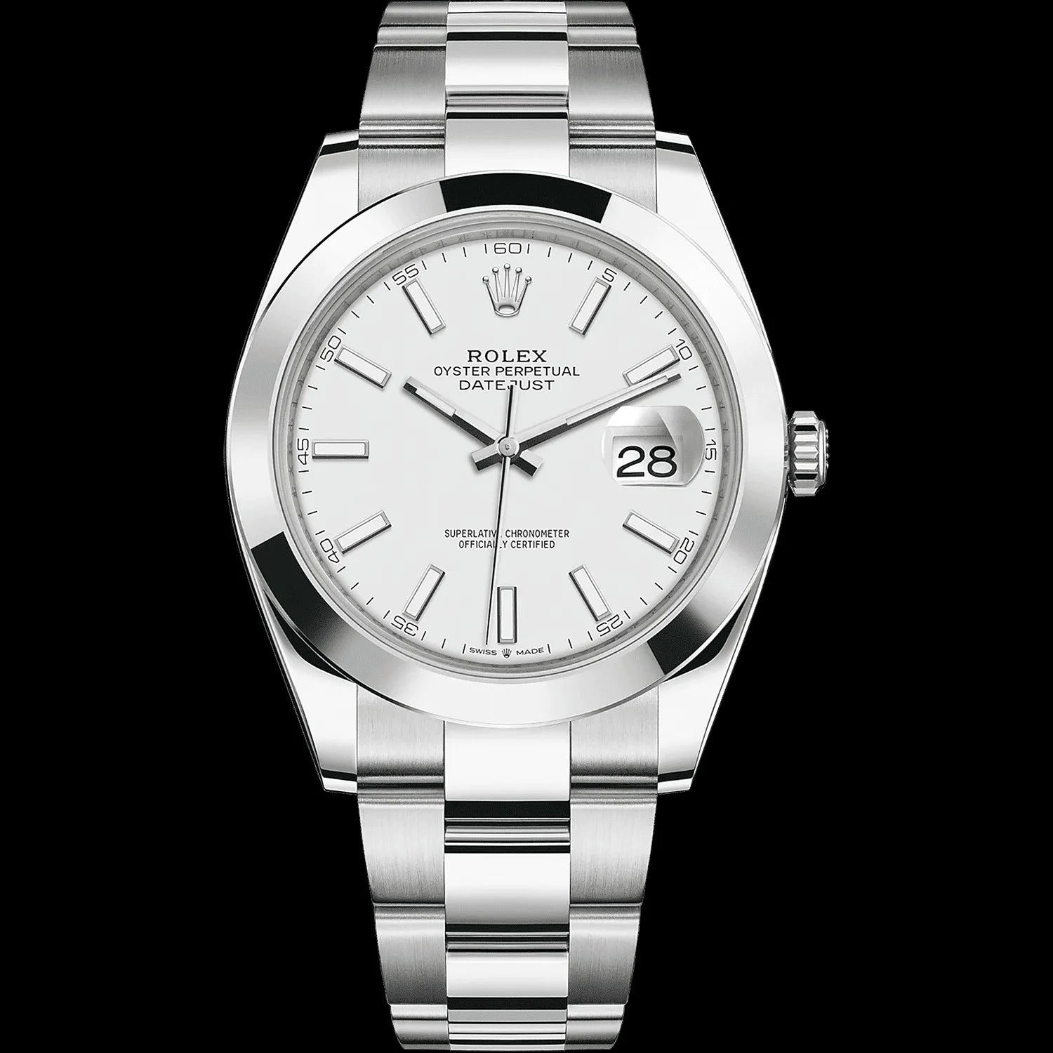 White dial. Dial Diameter: 41mm 904L Stainless Steel Case. Screw-in steel back. Screw-down crown with double-lock double water-resistance system. Smooth border. Anti-scratch double anti-reflection sapphire crystal with Cyclops lens dated. Self-winding movement. The date aperture is located at 3 o’clock and the power reserve is approximately 70 hours. 904L steel Oyster bracelet with flat three-piece links. Folding Oysterclasp with easylink 5mm extension for comfort. Water resistant to 100 meters.