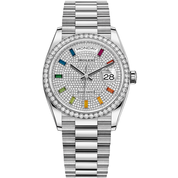 Dial size: 36mm. Overall case structure. Screw-down case back and winding crown. Diamond-set dial set with 10 baguette-cut iridescent sapphires. Scratch-resistant sapphire crystal, Cyclops lens with date. Bezel set with diamonds. Permanent mechanical self-winding movement with central hours, minutes and seconds. The window displays the current date and date. Quickly set and stop seconds. 70 hours of power reserve. Water resistant to 100 meters/330 feet. Presidential bracelet. Hidden folding clasp.
