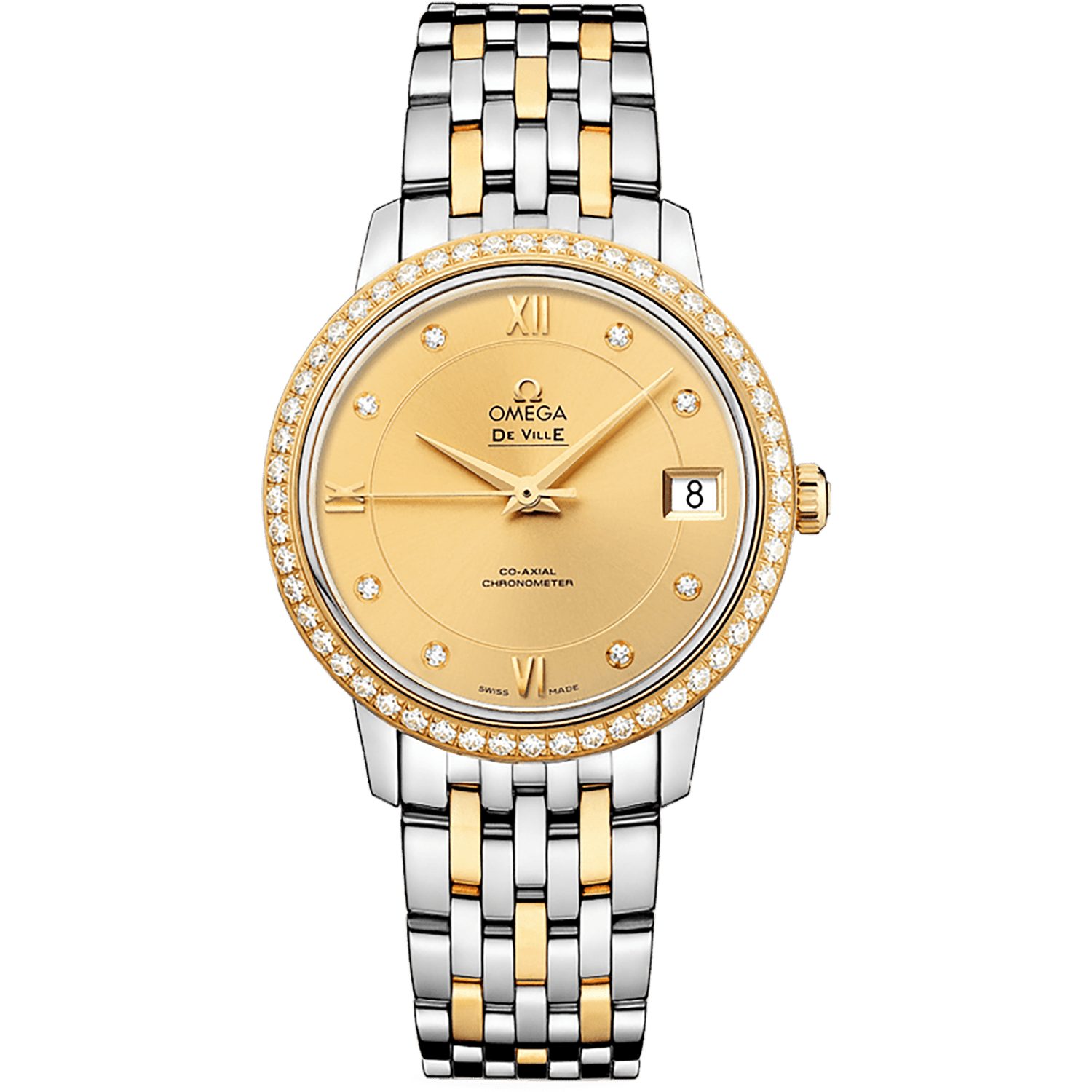 904L stainless steel case. Case diameter: 32.7 mm. Two-layer champagne sunray dial. With polished Roman numerals and 8 diamond hour markers. Polished gold hands. The date window is displayed at the 3 o’clock position. 48 hours of power reserve. Water resistance: 30 meters – 100 feet. Mirror material: Anti-reflective and scratch-resistant sapphire. Functions: hours, minutes, seconds, date, timer.