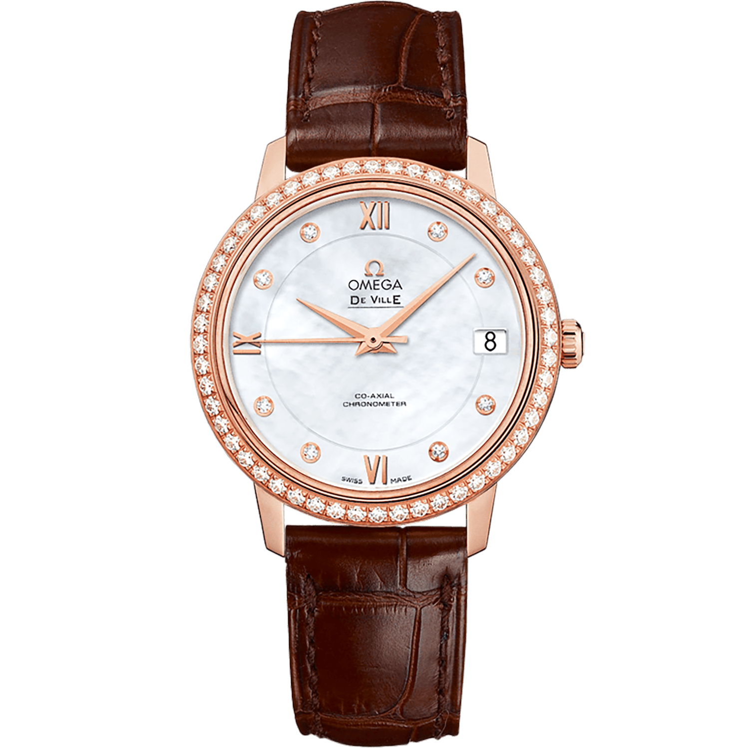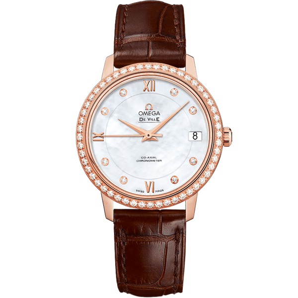 Case size: 32.7mm. Case Thickness: 9.5mm. Two-layer white mother-of-pearl dial. Polished rose gold Roman numerals and 8 diamond hour markers. Polished rose gold hands. The date window is displayed at the 3 o’clock position. Water resistant up to 30 meters. 48 hours of power reserve. Mirror material: Anti-reflective and scratch-resistant sapphire. Functions: hours, minutes, seconds, timer, date.