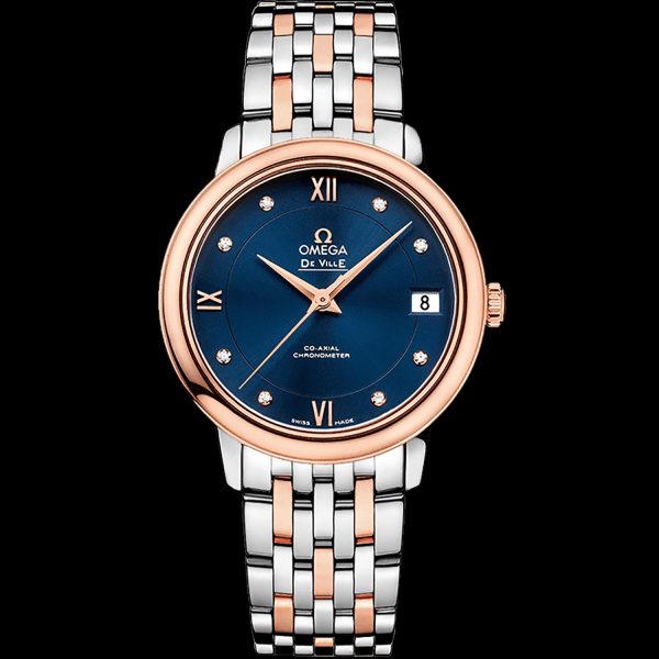 Polished 904L stainless steel case. Case size: 32.7mm. Case Thickness: 9mm. Blue dial, gold-tone toffee-style hands and diamond hour-markers. Roman numerals mark the 3, 6, 9 and 12 o’clock positions. Date displayed at 3 o’clock. Mirror Material: Scratch Resistant Sapphire Crystal. Pull/push crown. Sturdy back cover. Fold over button release buckle. Water resistant to 30 meters/100 feet. Bite at 25,200 vph. The power reserve is about 48 hours. Functions: date, hour, minute, second, timer.