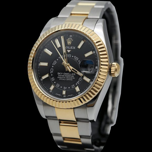 Screw it back. Screw-down crown. Scratch-resistant sapphire crystal with cyclops with date display. Double anti-reflective coating. Black dial. Index hour mark. Self-winding movement. A second time zone is displayed by an eccentric rotating disc. Annual calendar with date at 3 o’clock. Stainless Steel and 18k Yellow Gold Oyster Bracelet. Folding Oysterclasp with Easylink 5mm comfort extension. Water resistant to 100 meters.