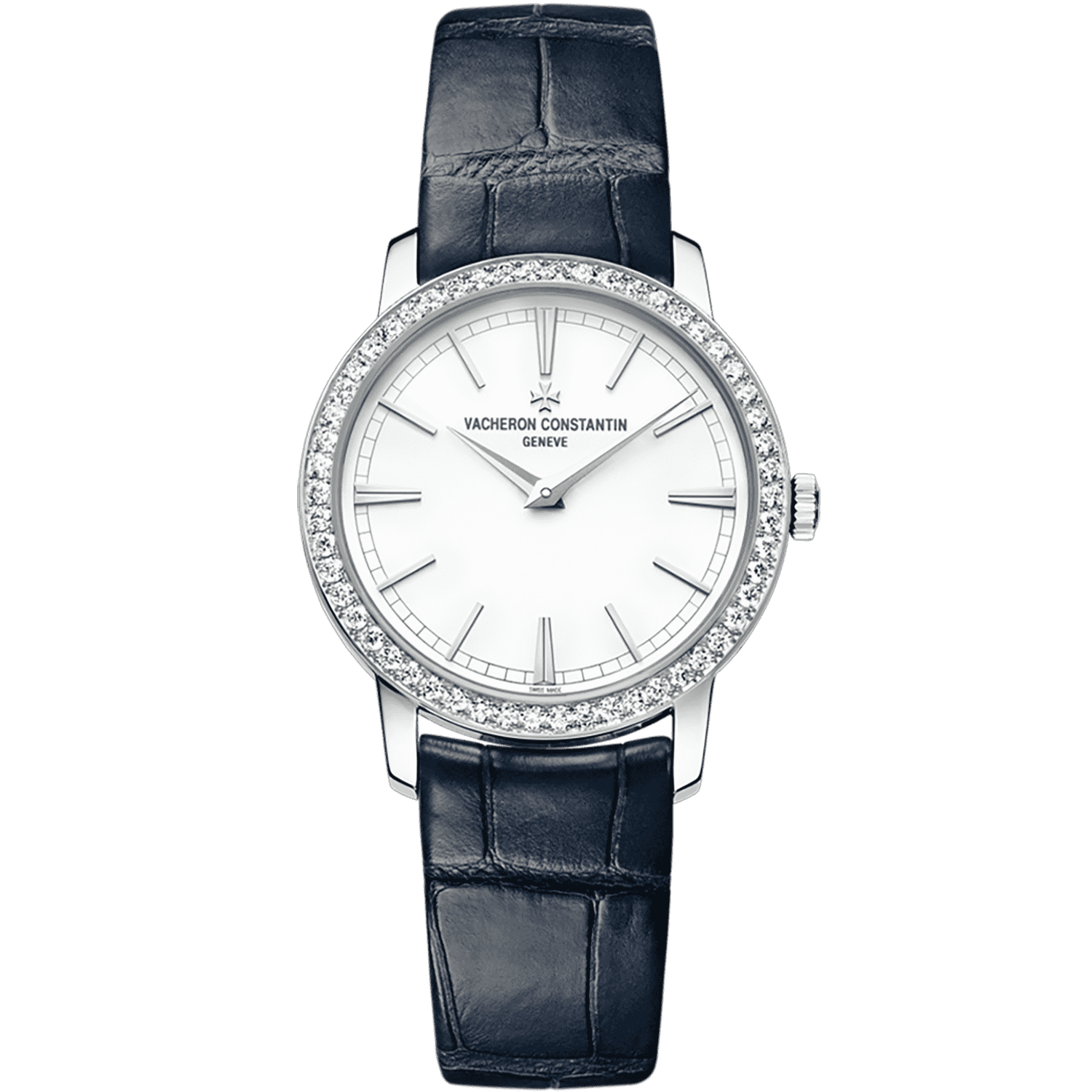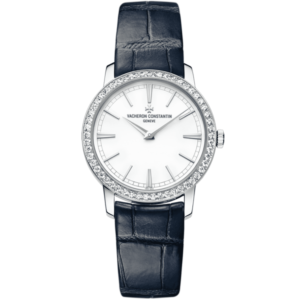 Polished white gold case. Bezel set with 54 round brilliant diamonds, silvered dial. Polished white gold hands. Applied polished white gold hour-markers. Fine black printed minute track. Composed of 98 parts containing 20 jewels, with a power reserve of approximately 40 hours. Water resistance: 30 metres – 100 feet, glass: anti-reflective and scratch-resistant sapphire